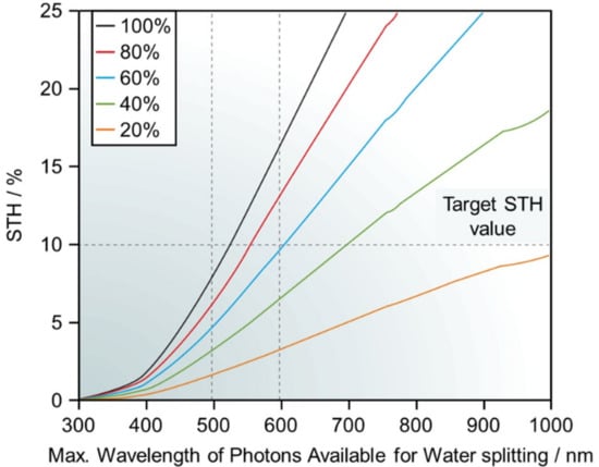Different apparent quantum yields (AQYs) covering the typical range of 20–100%. Dashed lines represent STH efficiencies at different AQYs with the maximum operable wavelength of 500 or 600 nm and the target STH value of 10%. Associated calculations assumed AM1.5G solar irradiance. Reproduced with permission from reference [44]. Copyright 2017 Springer Nature Limited.