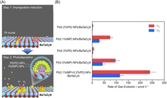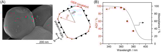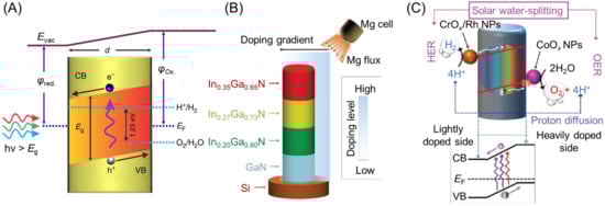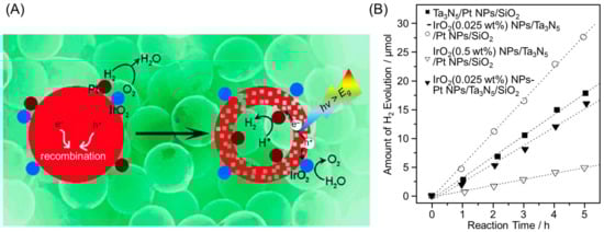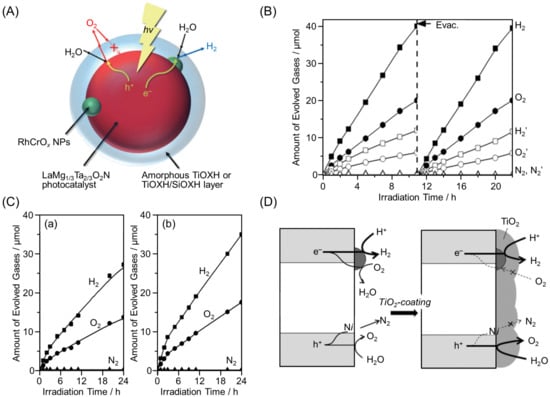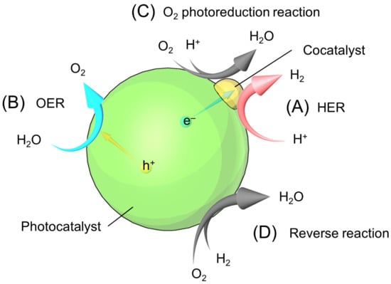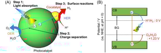 When a water-splitting reaction is conducted using a semiconductor photocatalyst, the reaction consists of three main steps (Figure 3A), as follows: (1) The semiconductor photocatalyst absorbs light energy, resulting in electronic excitation from the valence band (VB) to the conduction band (CB); (2) the excited electrons and remaining holes in the VB migrate to the photocatalyst surface or cocatalyst nanoparticles (NPs), respectively; (3) the H2 evolution reaction (HER; Equation (1)) and oxygen (O2) evolution reaction (OER; Equation (2)) proceed on the cocatalyst or photocatalyst surface.
