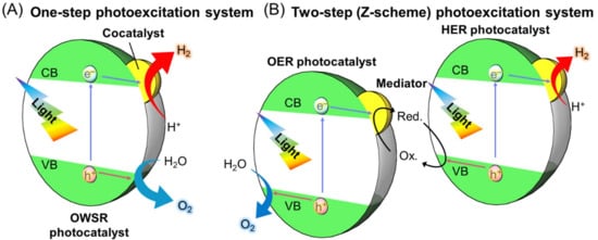 Schematic illustrations of photocatalytic reactions: (A) one-step photoexcitation system for overall water-splitting reaction (OWSR); (B) two-step (Z-scheme) photoexcitation system for OWSR. Red. and Ox. represent reductants and oxidants, respectively.