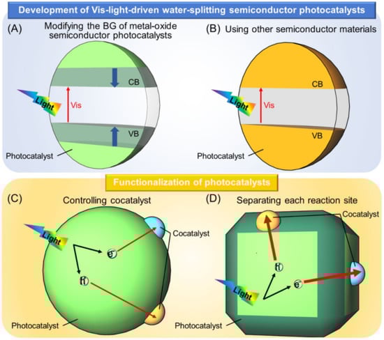 Schematic illustrations of the contents of Section 2, Section 3 and Section 4 in this review. Creation of Vis-light-driven water-splitting semiconductor photocatalysts by (A) modifying the BG of metal oxide semiconductor photocatalysts (UV-light-driven water-splitting photocatalysts; Section 2.1) and (B) using other semiconductor materials (Section 2.2). Functionalization of photocatalysts by (C) controlling the cocatalysts (Section 3) and (D) separating each reaction site (Section 4).