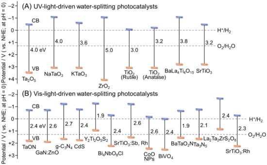 Band structures of (A) UV-light-driven and (B) Vis-light-driven water-splitting photocatalysts. In this figure, only semiconductors for which the band structure at pH = 0 has been reported are described. For the BG values of these and other semiconductors, please also see Table 1 [51,87,90,91,92,93,94,95,96,97,98,99].