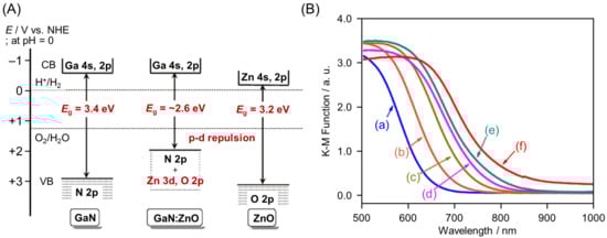 Semiconductor materials with the same crystal structure can easily form a solid solution [136]. The BG and energy levels of the solid solution continuously change depending on the ratio of the two types of semiconductor material [129,130,131,132,133]. Domen and co-workers succeeded in creating GaN:ZnO, which provided the first example of efficient and stable Vis-light-driven OWSR (Figure 10A) by solid-solution formation from GaN (3.4 eV) and ZnO (3.2 eV), which are UV-light-driven photocatalysts [137]. In this solid solution, both Zn 3d and N 2p electrons were present in the VBM, and p–d repulsion occurred between them [137,138], resulting in a narrower BG for this solid solution (~2.6 eV) compared with those of GaN (3.4 eV) and ZnO (3.2 eV) (Figure 10A). In 2017, Domen and co-workers also succeeded in creating La5Ti2Cu(S1−xSex)5O7 (LTCS1−xSex), which is a solid solution of La5Ti2CuS5O7 (~1.9 eV) and La5Ti2CuSe5O7 (1.5 eV) (Figure 7 and Table 1) [132]. The absorption edge of this solid solution shifted monotonically toward longer wavelengths with increasing Se content and, at x = 1, the solid solution absorbed light up to 820 nm (Figure 10B). At x = 0.2, HER activity was observed under Vis-light irradiation of up to 720 nm (Figure 10B).
