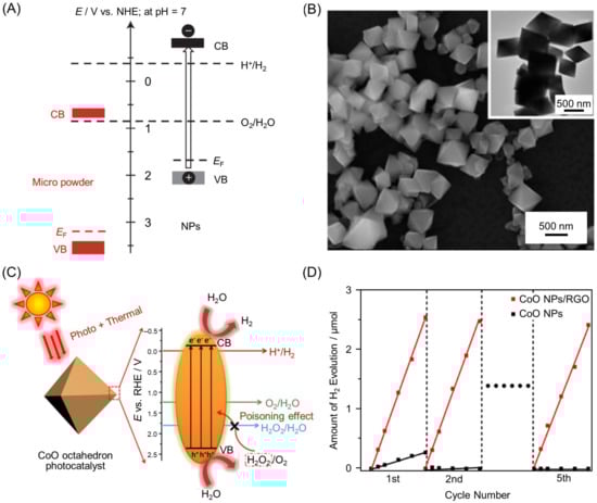 (A) Band positions of CoO micropowders and NPs. (B) Scanning electron microscopy (SEM) image of CoO octahedra (inset, transmission electron microscope (TEM) image). (C) Mechanism of overall water splitting over CoO octahedron photocatalyst. (D) Cycle stability of H2 evolution from pure water under Vis-light irradiation (λ > 400 nm) using CoO/reduced graphene–oxide (RGO) composite and CoO octahedra (each cycle is 24 h). Reproduced with permission from references [134,135]. Copyright 2014 Springer Nature Limited and 2017 American Chemical Society.
