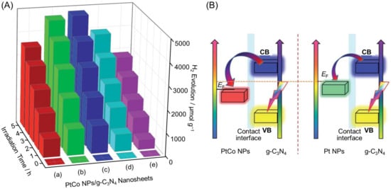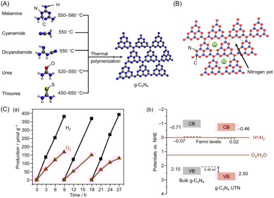 In addition, several studies have shown that OWSR can be achieved by changing the morphology of g-C3N4 [172,173]. For example, in 2021 Bao, Pu, and Wang successfully exfoliated g-C3N4 by irradiating bulk g-C3N4 with a femtosecond pulsed laser and thereby synthesized g-C3N4 ultra-thin nanosheets (UTN) [152]. The deposition of platinum (Pt) single atoms on g-C3N4 UTN resulted in OWSR with a H2 production rate of 42.6 µmol g−1 h−1 and an O2 production rate of 18.7 µmol g−1 h−1 (Figure 13C(a)). They attributed this phenomenon to the formation of C≡N defects caused by laser stripping, which induced the two following things: (1) aiding the loading of Pt single atoms and thereby increasing the number of active sites, and (2) downshifting the CBM and VBM to promote the OER (Figure 13C(b)).