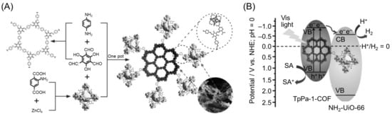 In 2018, Lan and co-workers reported the development of a hybrid photocatalyst of a COF (TpPa-1-COF) and a MOF (NH2-UiO-66) [153]. The hybrid photocatalyst had a band structure suitable for charge separation, and the COF and MOF were strongly connected by covalent bonds (Figure 14A). In these hybrid photocatalysts, the transfer of excited electrons occurred efficiently (Figure 14B), resulting in high HER activity (Table 2).
