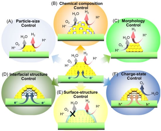 Schematic of photocatalyst functionalization by controlling cocatalyst properties: (A) particle size (Section 3.1), (B) chemical composition (Section 3.2), (C) morphology (Section 3.3), (D) interfacial structure (Section 3.4), (E) surface structure (Section 3.5), and (F) charge state (Section 3.6).