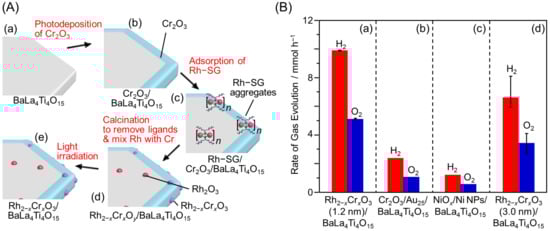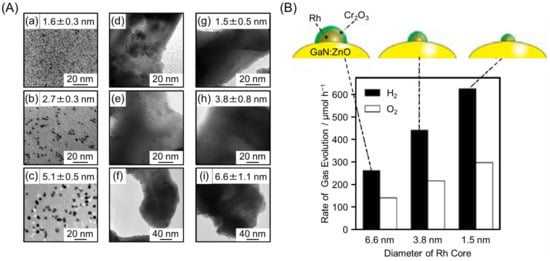 The size of cocatalyst NPs has a significant effect on the photocatalytic activity. For example, Teranishi and co-workers synthesized monodisperse Rh NPs of different sizes (1.6 ± 0.5, 2.7 ± 0.3, or 5.1 ± 0.5 nm) using a polyol synthesis method, and then this HER cocatalyst was loaded on GaN:ZnO (Rh NPs/GaN:ZnO) by removing the ligands via calcination [218]. Transmission electron microscopy (TEM) images (Figure 18A) showed that the Rh NPs cocatalyst was slightly aggregated on GaN:ZnO but still highly monodisperse (1.5 ± 0.3, 3.8 ± 0.8, or 6.6 ± 1.1 nm). A Cr2O3 shell (see Section 3.5.1) was then formed on the Rh NPs (Cr2O3/Rh NPs/GaN:ZnO), which acted as a reverse-reaction suppressor layer. The water-splitting activity of Cr2O3/Rh NPs/GaN:ZnO was enhanced with a reduction in size of the Rh NPs cocatalyst (Figure 18B and Table 3). These size effects were attributed to an increase in the proportion of surface atoms (HER active sites) in the Rh NPs cocatalyst, and enhanced charge separation as the Rh NPs cocatalyst decreased in size. Such an enhancement of the water-splitting activity caused by a reduction in size of the cocatalyst has also been observed in our study on gold (Au)-NCs or Rh2−xCrxO3-NCs-loaded BaLa4Ti4O15 photocatalysts (UV-light-driven photocatalysts; Figure 19) [73,74,75,77].