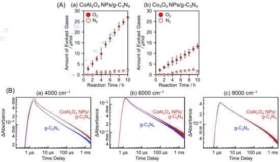 - Yamakata, A.; Kawaguchi, M.; Nishimura, N.; Minegishi, T.; Kubota, J.; Domen, K. Behavior and Energy States of Photogenerated Charge Carriers on Pt- or CoOx-Loaded LaTiO2N Photocatalysts: Time-Resolved Visible to Mid-Infrared Absorption Study. J. Phys. Chem. C 2014, 118, 23897–23906. [Google Scholar] [CrossRef]