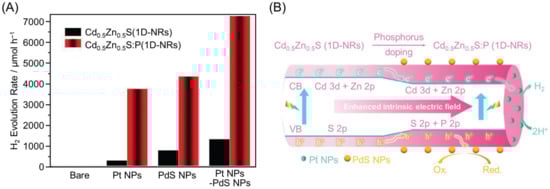 - Khan, K.; Tao, X.; Shi, M.; Zeng, B.; Feng, Z.; Li, C.; Li, R. Visible-Light-Driven Photocatalytic Hydrogen Production on Cd0.5Zn0.5S Nanorods with an Apparent Quantum Efficiency Exceeding 80%. Adv. Funct. Mater. 2020, 30, 2003731. [Google Scholar] [CrossRef]