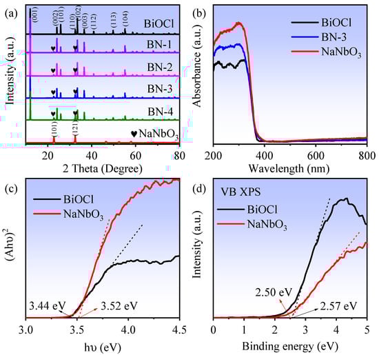 (a) XRD patterns of BiOCl, NaNbO3, and BiOCl/NaNbO3 piezoelectric composites; (b) UV–vis absorption spectra; (c) the estimated band gaps of BiOCl and NaNbO3; (d) VB XPS spectra of BiOCl and NaNbO3.