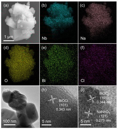 The morphology and microstructure of the BN-3 powder were investigated by scanning electron microscopy (SEM), element mapping and transmission electron microscope (TEM), and the results were shown in Figure 2. From Figure 2a, the irregular particles can be observed and the distribution of the corresponding main elements are shown in Figure 2b–f. The different colored areas suggest that Nb-, Na-, O-, Bi-, and Cl-enriched areas of the BN-3 composite, respectively. The TEM image of the BN-3 powder is displayed in Figure 2g. The lattice spacing of 0.343 and 0.273 nm in Figure 2h–i are corresponding to the (101) of BiOCl and (121) plane of NaNbO3, respectively. The result agrees well with that in the XRD patterns as shown in Figure 1a.