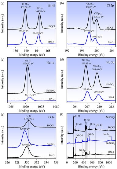 XPS survey spectra of BiOCl, NaNbO3, and BN-3: (a) Bi 4f; (b) Cl 2p; (c) Na 1s; (d) Nb 3d; (e) O 1s; (f) Survey.