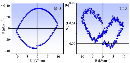 The polarization electric field hysteresis loop (P-E) and electric-field-induced strain (S-E) curves of BN-3 composite are displayed in Figure 4. From Figure 4a, a saturated and nearly squared P-E loop can be observed, and the remnant polarization (Pr) is 35.13 μC/cm2 and the coercive field (Ec) is 8.72 kV/mm. The result shows that BN-3 composite has well ferroelectric properties, favoring the spatial separation and transportation of photo-induced carriers [23]. The S-E curve in Figure 4b exhibits an asymmetric butterfly shape, confirming the piezoelectricity of the BN-3 composite [24,25].