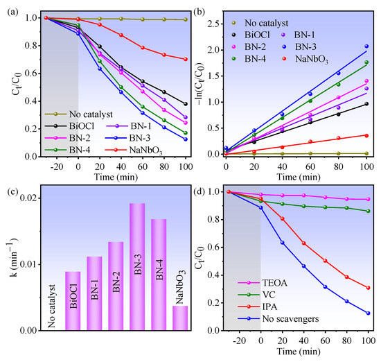 Consequently, the piezo/photocatalytic activities of BiOCl, NaNbO3, and BiOCl/NaNbO3 piezoelectric composites were evaluated by the degradation of Rhodamine B (RhB) under the condition of light irradiation and ultrasound. From Figure 5a, BN-3 exhibits better piezo/photocatalytic performance than that of BiOCl, NaNbO3, and other content BiOCl/NaNbO3 composites. The rate constant k values are obtained from Figure 5a via the pseudo-first-order equation [26]: , where C0 is RhB concentration for initial and Ct is for after irradiation time t. And the decomposition ratio is calculated via the formula: As shown in Figure 5b, the apparent reaction rate constant k for BiOCl, BN-1, BN-2, BN-3, BN-4, and NaNbO3 is 0.0089, 0.0112, 0.0134, 0.0192, 0.0168, and 0.0037 min−1, respectively. The piezo/photodegradation rate of RhB for BN-3 is 2.2 and 5.2 times higher than that of BiOCl and NaNbO3, the histogram in Figure 5c reflects this directly. The degradation percentages of BiOCl, NaNbO3 and BN-3 are 29.8%, 61.9% and 87.4%, respectively. In addition, the BET surface areas of BiOCl, NaNbO3, and BN-3 are 0.24, 2.00, and 1.32 m2/g, and the pore volumes are 0.0008, 0.0088, and 0.0037 cm3/g, respectively. The BET surface areas of the samples are in the same order of magnitude, which means the BET surface areas not can decisive the catalytic activity. This result indicates the heterojunction in BN-3 exerts a tremendous advantage on the piezo/photocatalytic process. To investigate the most reactive species during the process of RhB decomposition, the radical trapping experiments were carried out in the presence of BN-3 as a catalyst. From Figure 5d, the piezo-photodegradation efficiency of RhB is remarkably inhibited while adding the triethanolamine (TEOA, 50 µL) scavenger for trapping hole (h+) to the mixed solution, demonstrating an important role of h+ in the piezo-photocatalytic process. While L-ascorbic acid (VC, 40 mg) for superoxide radical (·O2−) was added, the degradation efficiency also decreased rapidly. The RhB degradation efficiency is decreased slightly by adding the isopropanol (IPA, 50 µL), reflecting the hydroxyl radical (·OH) plays a secondary role in this process. These results indicate that the effect in this piezo-photocatalytic process is: h+ >·O2− >·OH.