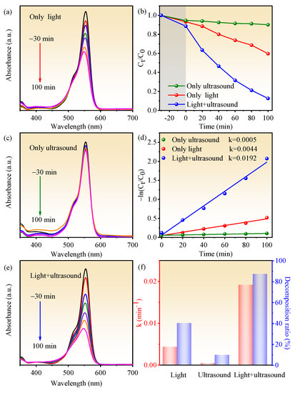 UV–vis spectral absorption of RhB for BN-3 under the condition of (a) only light, (c) only ultrasound and (e) light + ultrasound; (b) the kinetic curves of RhB degradation for BN-3 under these three control conditions; (d) the dynamics of degradation reaction [(−ln(Ct/C0)]; (f) the histogram of corresponding reaction rate constant and decomposition ratio.