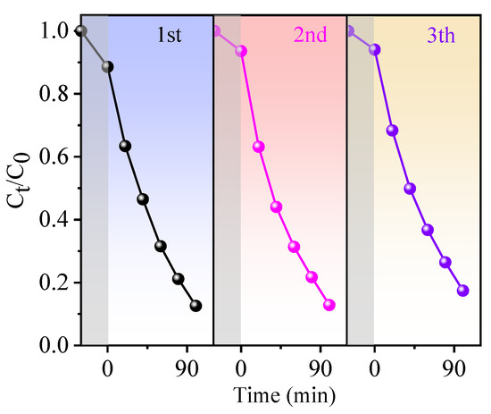 To demonstrate the piezocatalysis, photocatalysis, and the synergy effect of piezocatalysis and photocatalysis of BN-3 piezoelectric composite, the RhB degradation capability within 100 min was measured under the condition of ultrasound only, light only, and ultrasound + light together. UV–vis absorption spectra of RhB for BN-3 under different conditions are shown in Figure 6a,c,e, which correspond to light, ultrasound, and both light and ultrasound, respectively. From Figure 6b,d,f, the degradation rate is the lowest under the condition of only ultrasound, the rate constant k (0.0005 min−1) and decomposition ratio (9.9%) are well below those of the condition of only light (0.0044 min−1 and 40.4%) and light + ultrasound together (0.0192 min−1 and 87.4%). The decomposition ratio of RhB under synergy of piezocatalysis and photocatalysis is 8.8 and 2.2 times higher than that of piezocatalysis and photocatalysis, respectively. The rate constant k under synergy of piezocatalysis and photocatalysis is 38.4 and 4.36 times higher than that of only ultrasound and only light. In addition, based on the same condition, compared to other piezoelectric materials past reported, the k value of BN-3 is higher than that of NaNbO3/CuBi2O4 nanocomposites (0.0112 min−1) [27], and closing to that of BaTiO3/KNbO3 heterostructure (0.01492 min−1) [28]. The result confirms that the synergy effect of piezocatalysis and photocatalysis of BiOCl/NaNbO3 piezoelectric composite plays an important role in the highly efficient degradation of RhB. One of the key parameters in the piezo-photocatalyst is reproducibility, and Figure 7 shows the cycling performance of the piezo-photocatalytic activity of BN-3 for degrading RhB. After three cycles, the degradation efficiency is just reduced a little. This result evidences that BN-3 possesses a high reproducibility.