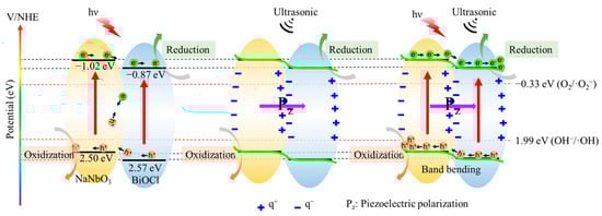 On the basis of the above analysis, the possible mechanism for piezocatalytic, photocatalytic, and their synergetic catalytic process of BiOCl/NaNbO3 piezoelectric composites are shown in Figure 8. According to our experiment, the valance band of NaNbO3 is 2.50 eV, while BiOCl is 2.57 eV; the conductive band of NaNbO3 is −1.02 eV, while BiOCl is −0.87 eV. In the condition of only light, the photoelectrons are excited from the valance band to the conductive band, and the electrons will transfer from the conductive band of NaNbO3 to the conductive band of BiOCl, and thus build an inner electric field. The built-in electric field can promote the separation of electrons and holes. However, there is still a combination of electrons and holes in the inner of BiOCl/NaNbO3 piezoelectric composites because the built-in electric field is easily prone to be screened by electrostatic compensated free space charges [29]. This reduces the degradation efficiency of RhB. In the condition of only ultrasound, the cavitation bubbles will form, expand, and burst, an amount of electric charge can be generated [30,31]. These positive and negative charges will transfer to the opposite directions under the influence of the alternating built-in electric field. In the condition of both light and ultrasound, the electrons and holes located at the conductive band and valance band will transfer to the opposite directions under the internal piezoelectric potential, causing electrons to accumulate in the conductive band of BiOCl and holes accumulate in the valance band of NaNbO3 [32,33,34]. Subsequently, the electrons on the CB of BiOCl combined with the absorbed O2 to produce ·O2−. Meanwhile, part holes on the VB of NaNbO3 will oxidize hydroxyl to form ·OH. Finally, the reactive species ·OH, h+, and ·O2− will participate in the oxidative degradation of RhB. The combination rate of electrons and holes will be reduced significantly under the built-in electric field, thus the decomposition ratio of BiOCl/NaNbO3 piezoelectric composite increased remarkably.