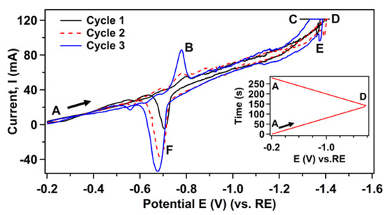 Initially, we have performed cyclic voltammetry (CV) to investigate the mechanism of the electrochemical process involving the reduction of nano-SiO2 to Si on the graphite -WE in CaCl2 melt at 855 °C. CV has been performed by a linear potential sweep (E), applied on the graphite-WE with respect to the Mo reference electrode (Mo-RE) at a scan rate of 10 mV/s. Shown in Figure 1 is the CV curve where the x-axis represents the applied potential (E), while the y-axis is the corresponding resulting current. The arrow in the CV curve indicates the direction in which the potential is scanned. The potential scan was repeated for three-cycles, and the inset of Figure 1 shows one complete cycle of the potential sweep. In one complete cycle, the potential is firstly scanned from the starting potential of −0.2 V (point A) to the more negative potential of −1.6 V (point D). This is referred to as the cathodic trace. The scan direction is then reversed, and the potential is swept positively back to (−0.2 V, point A), referred to as the anodic trace. As seen from the figure, during the cathodic scan (−0.2 V to −1.6 V) a gradual increase of the current appears starting after −1.0 V vs. graphite RE (cycle-1). We attribute this increase of the current due to the reduction of the nano-SiO2, where SiO2 starts to be reduced locally to make Si at the graphite WE.