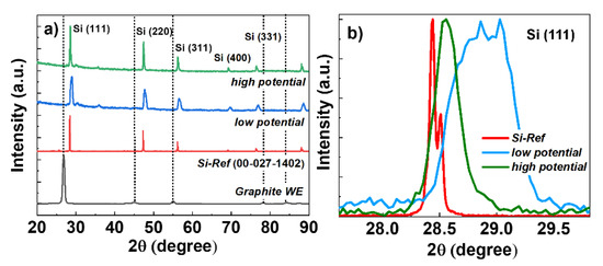 Shown in Figure 2a is the XRD plot of the samples prepared by constant reduction potential of low potential (E = −1.15 V) and high potential (E = −1.25 V) versus Mo-RE. To avoid the strong peaks from graphite substrates in the XRD patterns, we have peeled off the Si-layers from the graphite-WE and ground them to powder to conduct the XRD experiment. XRD of the graphite rod after peeling off the Si-layers was also taken. In addition, to confirm the peak positions of the electrodeposited Si, the XRD pattern of a crystalline Si has also been plotted in the same figure as a reference (ICDD standard: 00-027-1402). As seen from the figure, XRD patterns clearly confirm the formation of silicon (Si) phases on graphite substrates. In addition, it can be seen that with an increase of the reduction potential from low potential to high potential, the intensity of the XRD peaks increases and peaks become sharper with a decrease of the full width at half maximum (FWHM). Moreover, Gaussian analysis of the (111) diffraction plane (Figure 2b) shows a peak shift to 2θ = 28.88° for the sample deposited at low potential compared to the reference peak position at 2θ = 28.44°. Peak shift decreases to 2θ = 28.56° for the sample deposited at high potential. Roughly, this peak shift to the higher angle compared to the reference Si-peak can be attributed to the lattice contraction or formation of microstrain in the Si-deposits, the magnitude of which decreases with an increase of the reduction potential. The crystallite sizes of the Si-deposits are correlated with the broadening of the XRD peaks and can be calculated using Scherrer’s equation [30]: