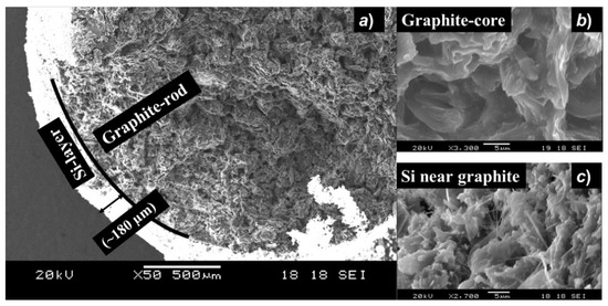 (a) Cross-sectional SEM image of the Si-coated graphite rod after electrochemical reduction of nano SiO2 at low potential and washed with HCl, (b) magnified image of the graphite core, (c) magnified image of the Si-layer close to the graphite-rod.