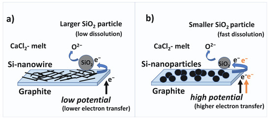 - Particle size of the SiO2: Finally, considering the higher dissolution rate, nano-SiO2 are more favorable to form Si-layers with larger grains in micro or polycrystalline levels at a given reduction potential due to a faster rate of electron transfer. SiO2 granules with larger particle sizes are suitable for the formation of Si at the nanoscale level (nanocrystals or nanowires) at the same reduction potential.