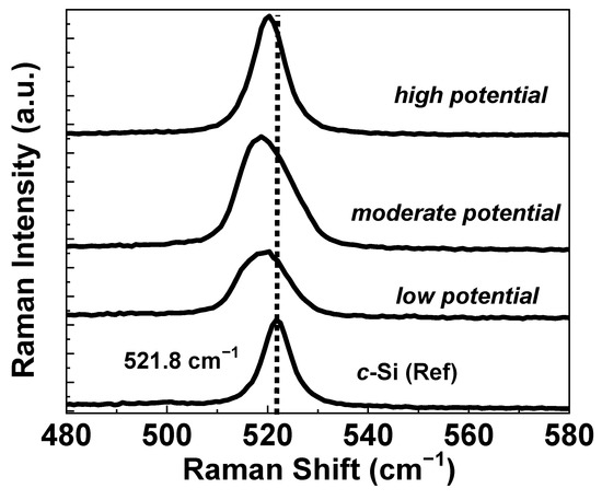 To study the optical properties of the Si-layers on graphite substrates, we have performed µ-Raman spectroscopy of the Si-layers deposited with different reduction potentials as shown in Figure 7. Raman spectrum of a single crystalline silicon (c-Si) wafer was also shown in the same figure as a reference. In fact, Raman is a non-destructive method to identify elemental composition including phase or molecules, and also their crystallinity in the sample. As seen from the figure, c-Si shows a sharp and symmetric peak around 521 cm−1 [35], which is associated with the Raman scattering by the Si optical phonon mode. In the case of Si in the amorphous phase, the phonon peak becomes broadened and shifts to lower wavenumbers at around 480 cm−1 [36,37]. As seen from the figure, no such formation of the amorphous phase has been apparent in the Raman spectra of the electrodeposited films, which suggests that Si-layers obtained in this study are basically crystalline in nature (plausibly due to growth at a higher temperature of 855 °C). However, it can be seen from the figure that the Raman peak of the deposited Si-layers slightly shifted to a lower wavenumber (i.e., down shift) comparing to the c-Si reference peak. Shifting of the optical phonon-band to a lower wavenumber comparing to that of single-crystal Si (bulk) primarily suggests the size-related quantum confinement effect due to the formation of microcrystalline or nanocrystalline phases. In nanostructured materials, the Raman scattering selection rule is relaxed (k = 0) due to increased disorder, originating from the smaller dimension of the crystallites. It causes the first order transition of phonons to shift away from the Brillouin-zone center, causing softening and asymmetric broadening of the phonon modes with a down shift in the Raman spectra [38,39]. Broadening of the Raman peaks in the deposited Si-layers may also originate due to the size distribution of the small crystallites in the sample. It is apparent from the figure that the down-shifting of the peak becomes more prominent in the samples deposited with more lower reduction potentials.