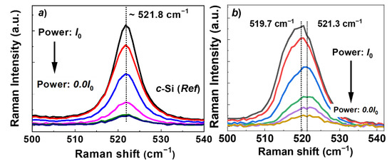 - Han, L.; Zeman, M.; Smets, A.H. Raman study of laser-induced heating effects in free-standing silicon nanocrystals. Nanoscale 2015, 7, 8389–8397. [Google Scholar] [CrossRef] [Green Version]