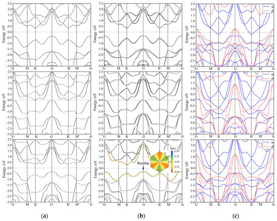 - Yao, Q.F.; Cai, J.; Tong, W.Y.; Gong, S.J.; Wang, J.Q.; Wan, X.G.; Duan, C.G.; Chu, J.H. Manipulation of the large Rashba spin splitting in polar two-dimensional transition-metal dichalcogenides. Phys. Rev. B 2017, 95, 165401. [Google Scholar] [CrossRef] [Green Version]