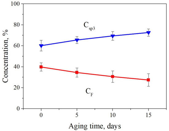 As the accumulation of hydrocarbon will inevitably happen on the fluorinated graphene, the concentrations of sp3 bonds Csp3 and C–F bonds CF with different aging time are shown in Figure 3. We observe that Csp3 slightly and linearly increases from 60.2 ± 5.1% to 72.6 ± 3.5%, whereas CF drops accordingly with time increases. This result indicates the stability of fluorographene during aging, and it provides further proof of the hydrocarbon accumulation even on the fluorinated surface during aging.