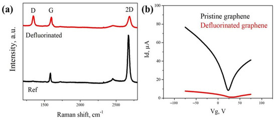 Characterizations of graphene after the fluorination/defluorination cycle: (a) shows the Raman spectra of initial pristine graphene and defluorinated graphene. The emerging D peak after defluorination suggests the introduction of disordering as a result of the electron beam irradiation; (b) shows the gated curves of pristine graphene (in black) and defluorinated graphene (in red).