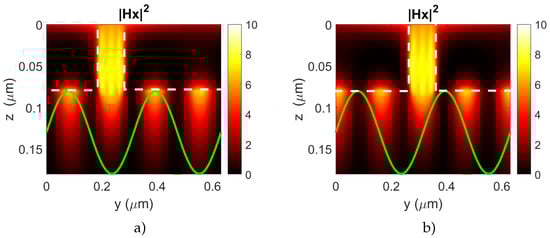 Now, let us analyze the dependence of the MO effect on the phase shift, , and how this can help to detect the spin waves in the magnetic layer. In Figure 4, the spatial distributions of the component of the excited SPP wave and the magnetization modulation with two different phase values are shown. In Figure 4a, the spatial distribution of the magnetization is non-symmetric inside the plasmonic grating cell, but the impacts of the half periods of the magnetization to the magneto-optical response compensate for each other.