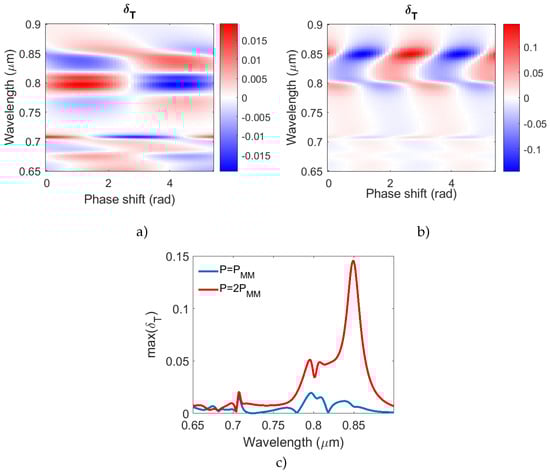 This problem can be overcome when the period of the magnetization modulation is equal to the half of the plasmonic grating period. The reason is that, in the considered setting at the interface of the [plasmonic grating]/[ferrimagnetic dielectric] for nm in the air, the SPP wavelength is about 313 nm []. Thus, if , the SPP mode wavelength is equal to , and the impact of the spatial symmetry breaking created by the magnetization modulation is stronger. The corresponding transmission and spectra are given in the right column of Figure 3 for the case of zero phase shift. The magnitude of the MO effect is comparable with the case of uniform magnetization distribution.