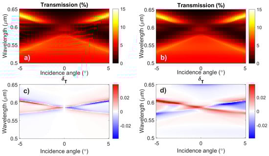 Angular and wavelength-resolved transmission (a,b) and (c,d) spectra of the nanostructure near the waveguide modes excitation area with (right column) and without (left column) the spatial modulation of the magnetization in the ferrimagnetic layer. The phase shift between the plasmonic grating and the magnetization modulation is 0.