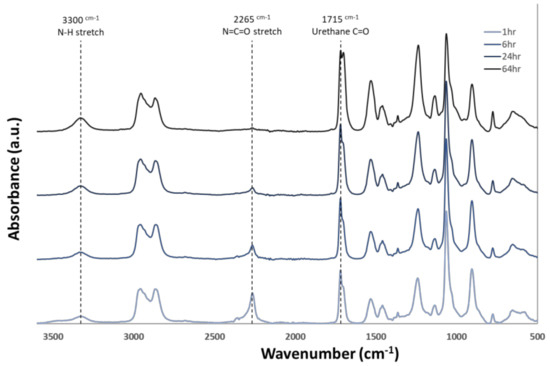 Attenuated total reflectance Fourier transform infrared (ATR − FTIR) spectra of thermoplastic over the duration of the synthesis process. Reduction of the isocyanate peak at 2265 cm−1 and an increase of urethane linkage groups at 1715 cm−1 and 3300 cm−1 can be seen as the reaction proceeds.