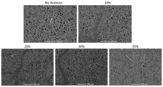 Scanning electron microscopy (SEM) images of electrospin scaffolds which were swollen with varying concentrations of acetone and then dried. Melding of fibers was observed when 35% acetone was used.
