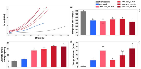 Tensile testing was used to further distinguish the influence of crosslinking parameters on material properties. Figure 4a shows the stress/strain curves for all conditions tested. Figure 4b shows that crosslinking reduces the elongation at break for the materials while Figure 4c,d show that it increases the ultimate tensile strength (UTS) and Young’s modulus. Additionally, a distinct jump in strength for materials crosslinked by swelling was observed. In comparing the influence of acetone concentration, it was observed that samples treated with 30% acetone had statistically higher UTS than those treated with 10%. Furthermore, a distinct increase in modulus was observed as the UV exposure time for the samples increased.