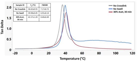 DMA testing was used to further understand the influence of crosslinking on the shape memory properties of this material. For these tests, three sample groups were used: No Crosslink, No Swell, and 30% Acet, 30 min. Figure 5 shows the tan delta curves for these three samples, demonstrating a shift in glass transition temperature with increased crosslinking as well as improved mechanical stability of the materials above their Tg.