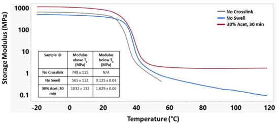 Figure 6 shows the storage modulus of these materials during a temperature sweep encompassing the glass transition temperature for each material. The No Crosslink sample group was unable to maintain structural integrity above 55 °C, and thus, no modulus below Tg could be recorded. The No Swell sample group was able to maintain structural integrity up to 120 °C but continued to decrease in storage modulus above its Tg. The 30% Acet., 30 min sample group had the highest modulus of any group both above and below its Tg and maintained its modulus above its Tg.
