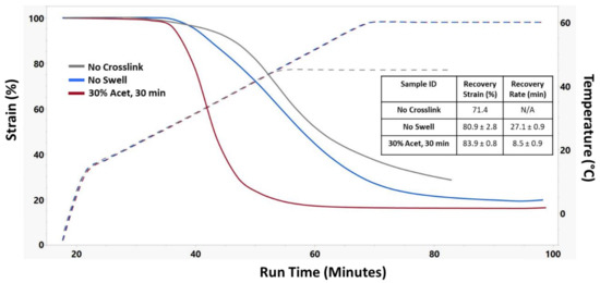 Recovery strain testing was performed for each sample using DMA, and results are shown in Figure 7. Due to their instability at high temperatures, the No Crosslink samples were only heated to 45 °C rather than the 60 °C like the No Swell and 30% Acet, 30 min samples. Interestingly, even though 30% Acet, 30 min samples had the highest glass transition temperature, they had the earliest shape recovery onset point. Additionally, they had a much faster recovery rate which was measured as the temporal distance between the onset points for the beginning and ending of the shape recovery process. The swollen crosslinked samples also had the highest shape recovery, suggesting that efficient crosslinking was an important factor in shape memory properties.