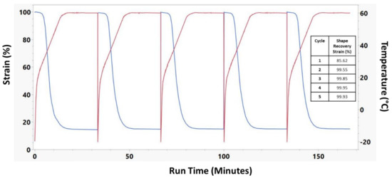 A cyclical shape recovery test was run on 30% Acet., 30 min samples and is presented in Figure 8. This test demonstrates that while the shape recovery strain for the first cycle was 85.62%, the shape recovery strain of subsequent cycles was nearly 100%.