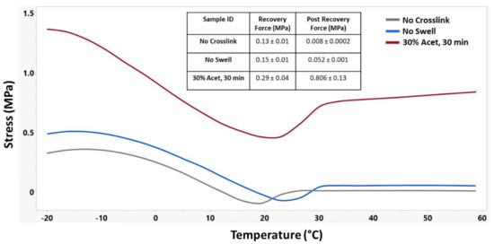 Figure 9 shows the shape recovery force for these materials. For these samples, the recovery force was measured as the difference in stress between the low point and the stress after shape recovery, while the post-recovery force was measured as the maximum force achieved after shape recovery. A distinct increase in the base stress along with the recovery stress of swollen and crosslinked samples can be observed.