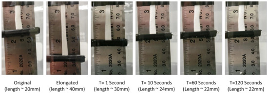 To demonstrate the shape memory effect of the electrospun material in physiologically relevant conditions, testing was performed in 37 °C water. A 30% acet, 30 min sample 20 mm in length was heated to 60 °C and stretched to approximately 40mm in length and allowed to cool back to room temperature. It was then hung vertically in a glass beaker and submerged in 37 °C water to induce shape recovery.