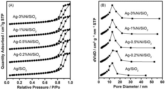 The N2 sorption isotherms of calcined catalysts (Figure 1A) all exhibited Langmuir type IV isotherms with H1-type hysteresis loop, characteristic of nanostructured materials with uniform mesopores [27,28]. The BJH pore size distribution curves based on the desorption isotherms all displayed only one pore distribution peak (Figure 1B), indicating that the pore size distribution of each sample was concentrated, and the pore size was in the mesoporous range. Compared with Ag/SiO2, the larger pore could be observed in the Ni-containing catalysts, illustrating that the incorporation of Ni species probably covered some small pores [12].