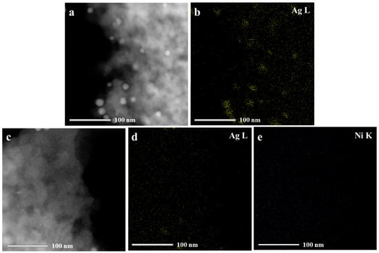 Figure 4. STEM and EDX-mapping images of calcined Ag/SiO2 (a,b) and Ag-0.5%Ni/SiO2 (c,d,e).