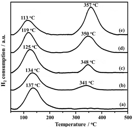 Temperature-programmed reduction with H2 (H2-TPR) was conducted on a linear quartz micro-reactor in which 100 mg catalyst was pretreated at 200 °C for 2 h under N2. After being cooled down to room temperature, the catalyst was exposed to 10% H2/N2 mixture (30 cm3∙min−1), and the temperature of the catalyst bed was ramped to 650 °C at a rate of 10 °C∙min−1. The H2 consumption was recorded using a thermal conductivity detector (TCD).