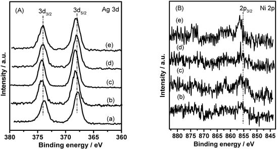 Figure 8. Ag 3d (A) and Ni 2p (B) photoelectron spectra of as-reduced catalysts: (a) Ag/SiO2, (b) Ag-0.2%Ni/SiO2, (c) Ag-0.5%Ni/SiO2, (d) Ag-1%Ni/SiO2, (e) Ag-3%Ni/SiO2.