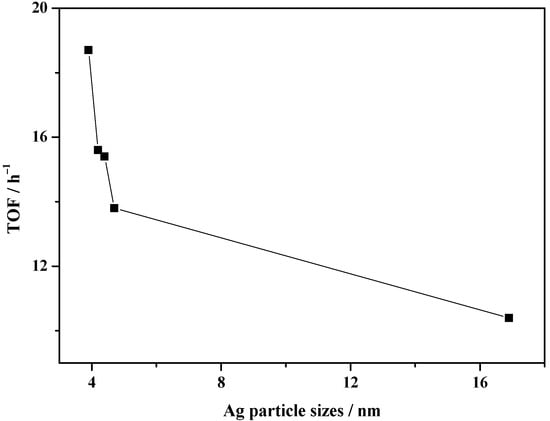 To clearly compare the catalytic performance between Ag/SiO2 and Ag-Ni/SiO2 in DMO hydrogenation, the TOF values of all catalysts were measured at the conversion of DMO lower than 30% by regulating the DMO liquid hourly space velocity (LHSV) [13]. The DMO conversion data were used to calculate the TOF according to the active metal dispersion (Table 3). When increasing the content of Ni, both the TOF and DAg values increased first, passing through a maximum, and then decreased at higher Ni contents. Ag-0.5%Ni/SiO2 with the highest catalytic activity possessed a TOF of 18.7 h−1, superior to Ag/SiO2 (10.4 h−1). Moreover, the addition of Ni into Ag/SiO2 promoted the dispersion of Ag on SiO2, consistent with TEM results. The TOF values as a function of Ag particle sizes of the different catalysts are shown in Figure 10. The TOF value declines gradually with the increase in Ag particle size over these catalysts, suggesting that the DMO hydrogenation is a structure-sensitive reaction [4,16,26].