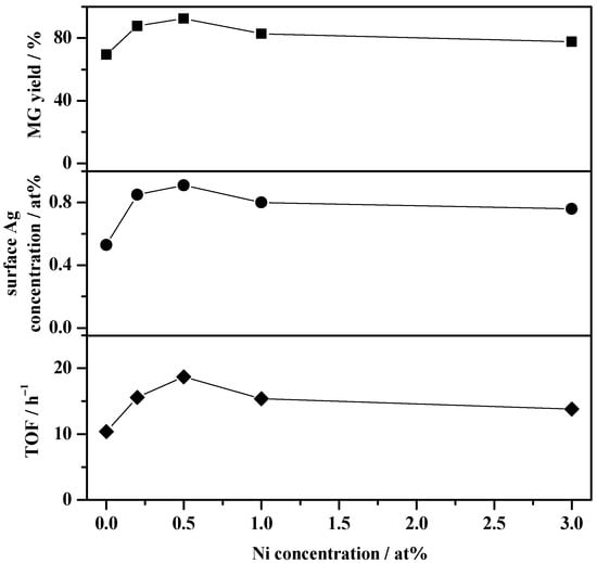 Figure 11. The influence of Ni content on MG yield, surface Ag concentration, and TOF values.