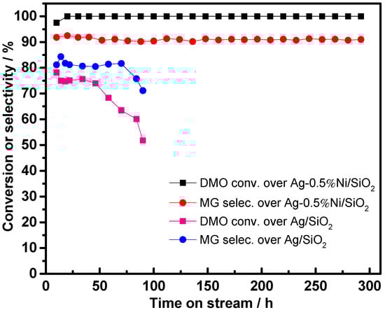 Figure 12. The long-term performance of the Ag/SiO2 and Ag-0.5%Ni/SiO2 catalysts. Reaction conditions: 493 K, 1.5 MPa, H2/DMO molar ratio = 150, LHSV = 0.28 h−1.