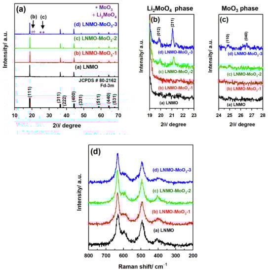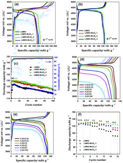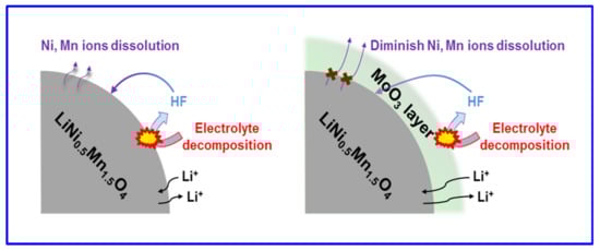 - Bai, N.; Ma, Y.J.; Wang, A.M.; Luo, X. Effects of MoO3 coating on the structure and electrochemical performance of high-voltage spinel LiNi0.5Mn1.5O4. Ionics 2021, 27, 469–478. [Google Scholar] [CrossRef]